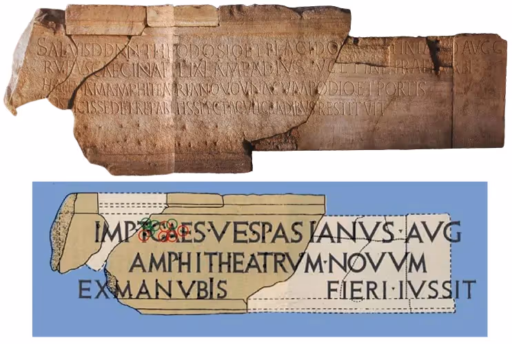 Vespasiano comenzó a construir el Coliseo en el año 72 EC. Es el anfiteatro más grande y lujoso de Roma, conocido por sus famosos concursos de gladiadores y otros espectáculos. El proyecto fue financiado principalmente por el botín de guerra contra los judíos. En la imagen está la inscripción del coliseo que dice: «Ex Manubiis», que significa «[financiado] con el botín de guerra».