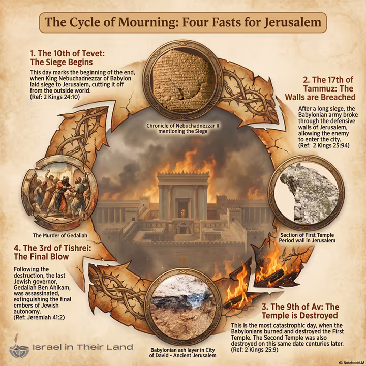 The cycle finishes with the murder of the last governor of Israel, Gedalyah, son of Ahikam, known as the fast of Gedalyah on the 3rd of Tishrei.