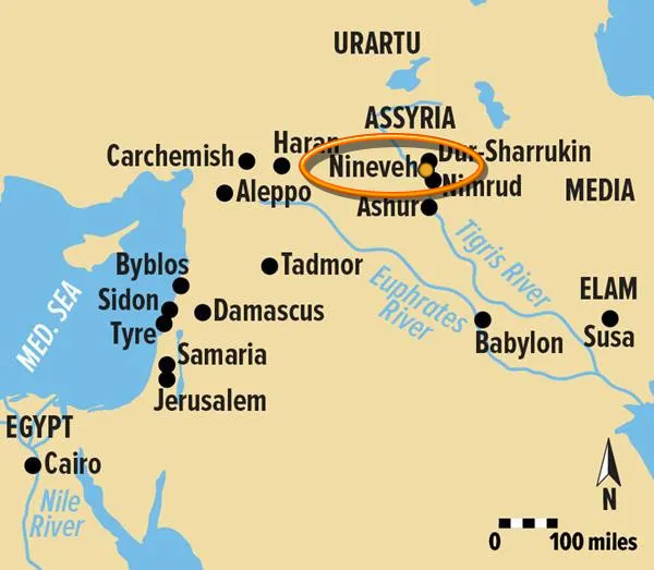 Ассирийский город Ниневия располагался в курдской части северного Ирака, там, где теперь находится город Мосул, в 320 км к северу от Багдада.