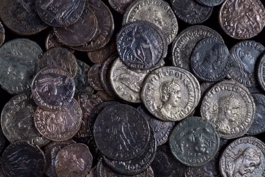 הארכיאולוג שחר קריספין מחזיק את מטמון המטבעות.